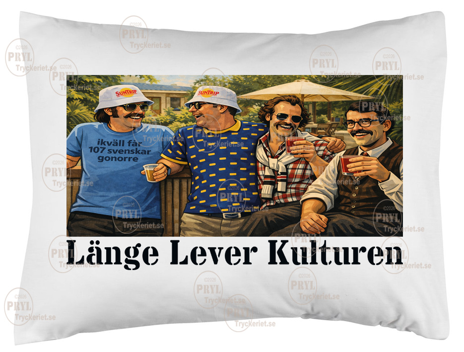 Solbrända minnen, plastglas med något kallt i och svensk charter när den var som bäst. Detta örngott hyllar den tidlösa kultklassikern Sällskapsresan – filmen som fortfarande får oss att le, citera repliker och känna igen oss, generation efter generation.